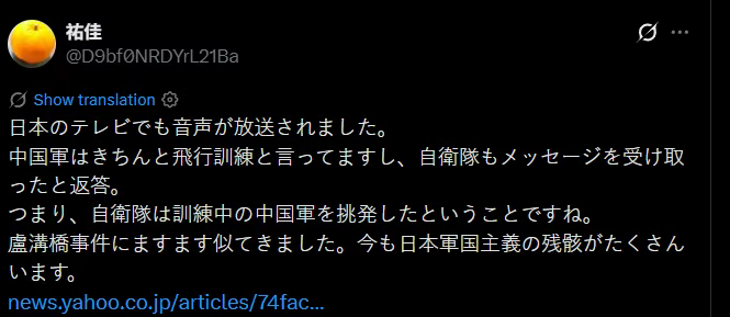 结果,在中方通过媒体公布了重要的证据后,日本才扭扭捏捏地改口。而不少日本网民则怒斥高市早苗政府欺骗大众。有人甚至感叹说,日方的做法让人想起了当年日本帝国主义者为入侵中国而炮制卢沟桥事变的撒谎套路。