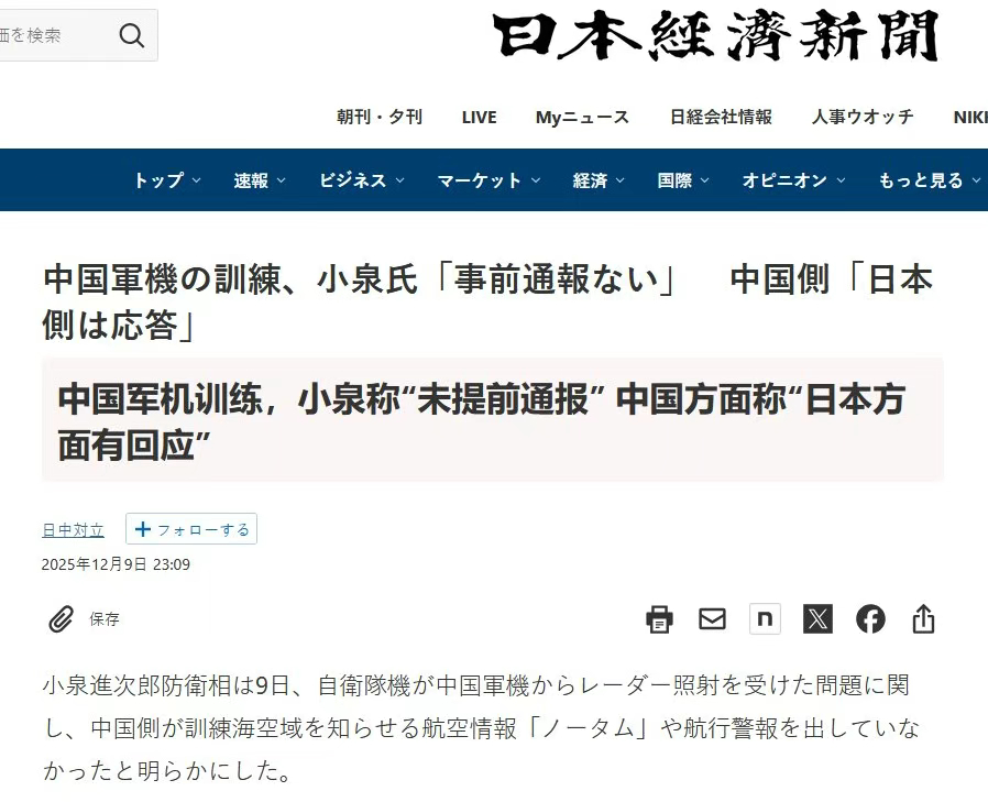 不仅如此,根据《日本经济新闻》的报道,高市早苗内阁的防卫大臣小泉进次郎在事发后还公然撒谎,说中方没有通报训练的事情给日方。